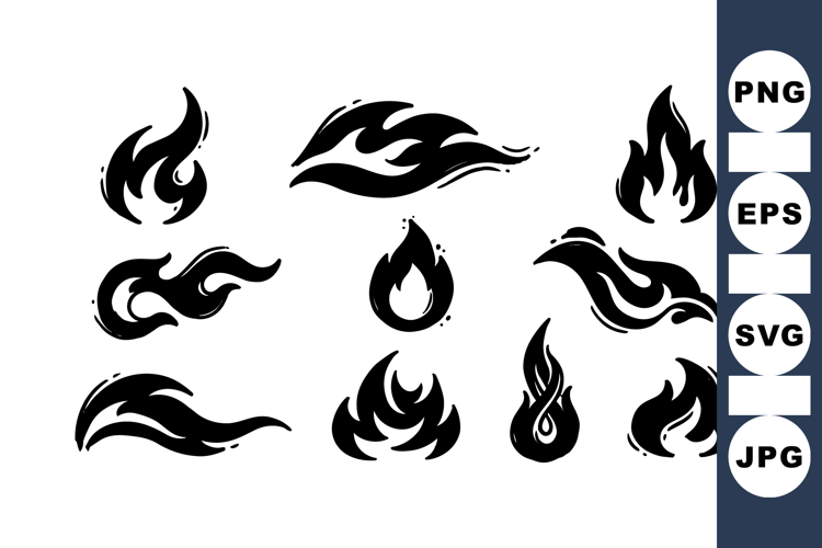 Collection of ten black flame icons with abstract and stylized fire shapes in flat vector design, useful for logo design, branding projects, or digital illustrations with minimalist mood.