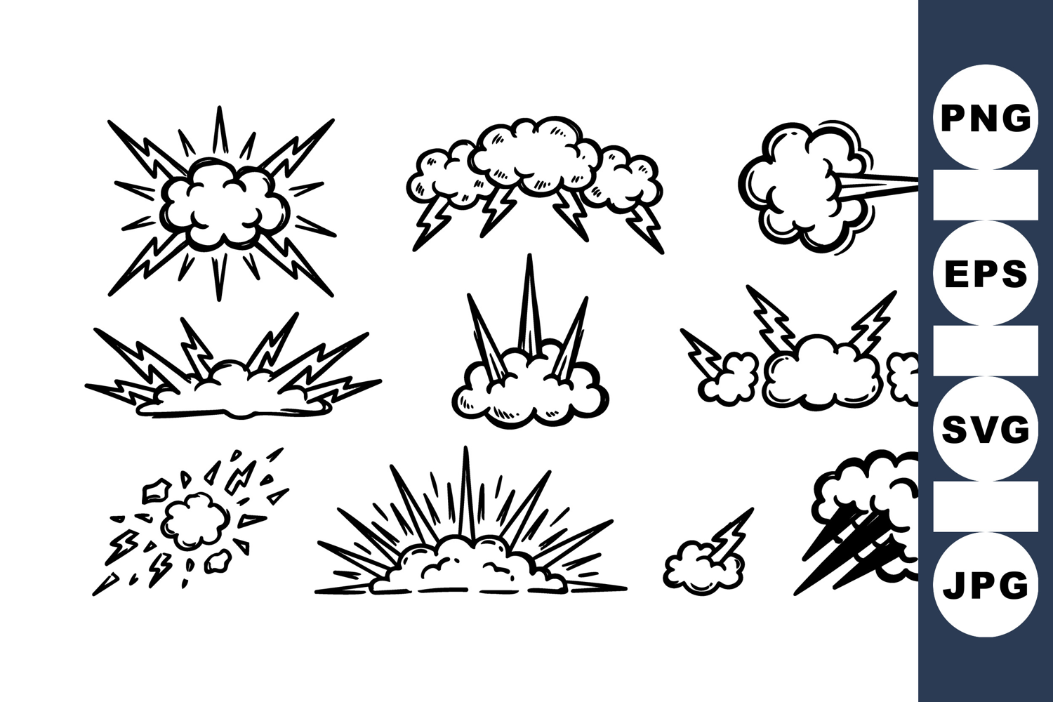 A collection of black and white comic style explosive cloud bursts with sharp lightning bolts and energy spikes in dynamic forms, suitable for graphic design and comic art, energetic mood.