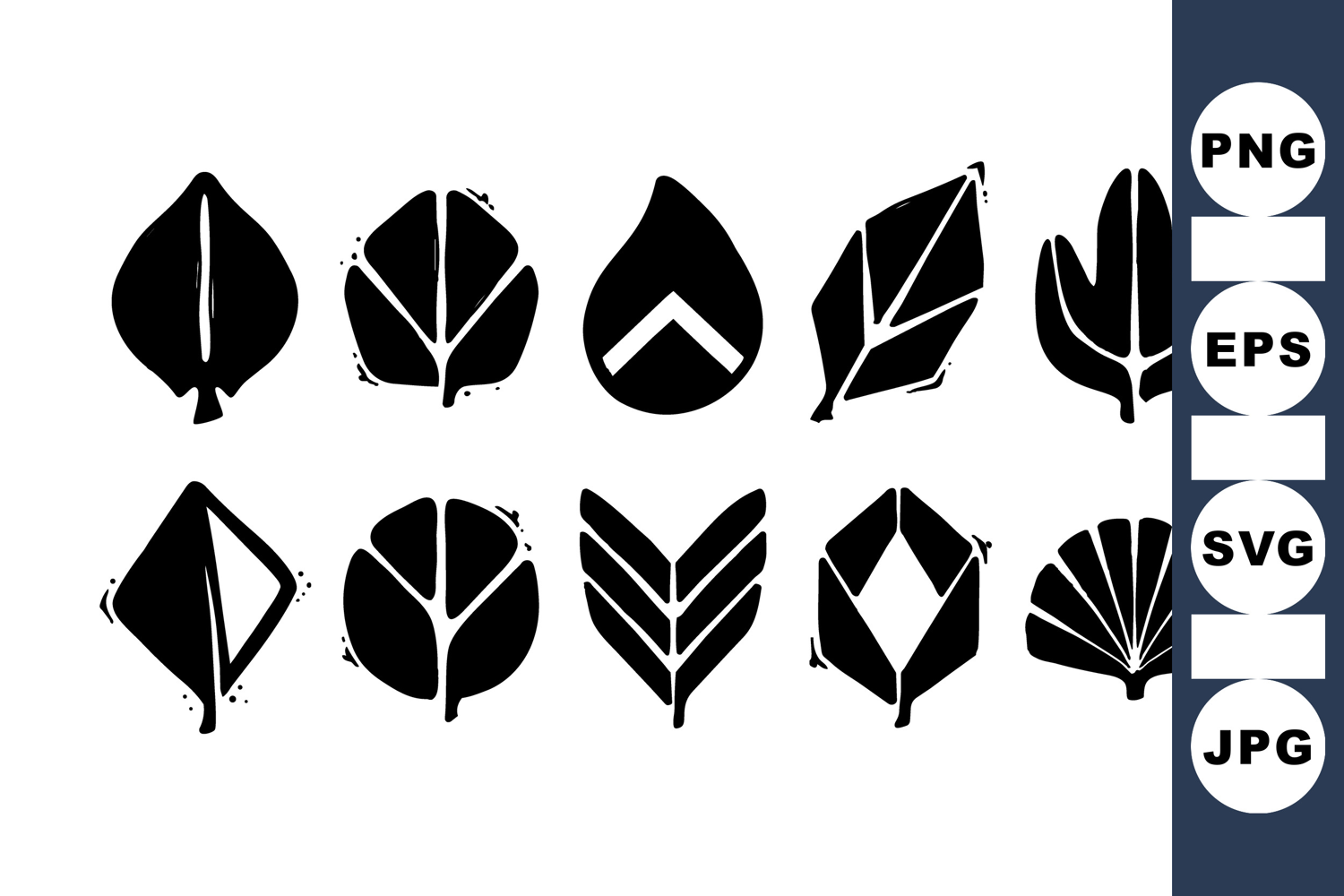 Abstract vector art of black leaf silhouettes featuring geometric patterns and botanical design elements. ideal for graphic resources, logos, icons, and decorative nature themed projects in a minimalist style.