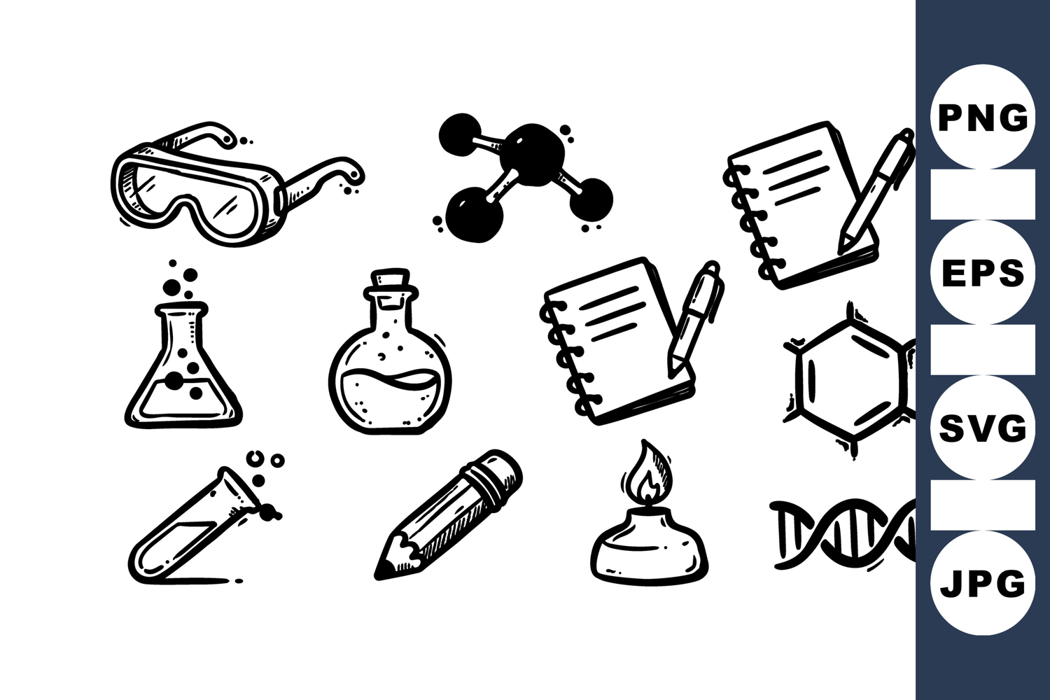 Black and white hand drawn vector icons feature chemistry lab tools including molecule structure, dna strand, laboratory glassware, notebook with pencil, and protective goggles for science themes.