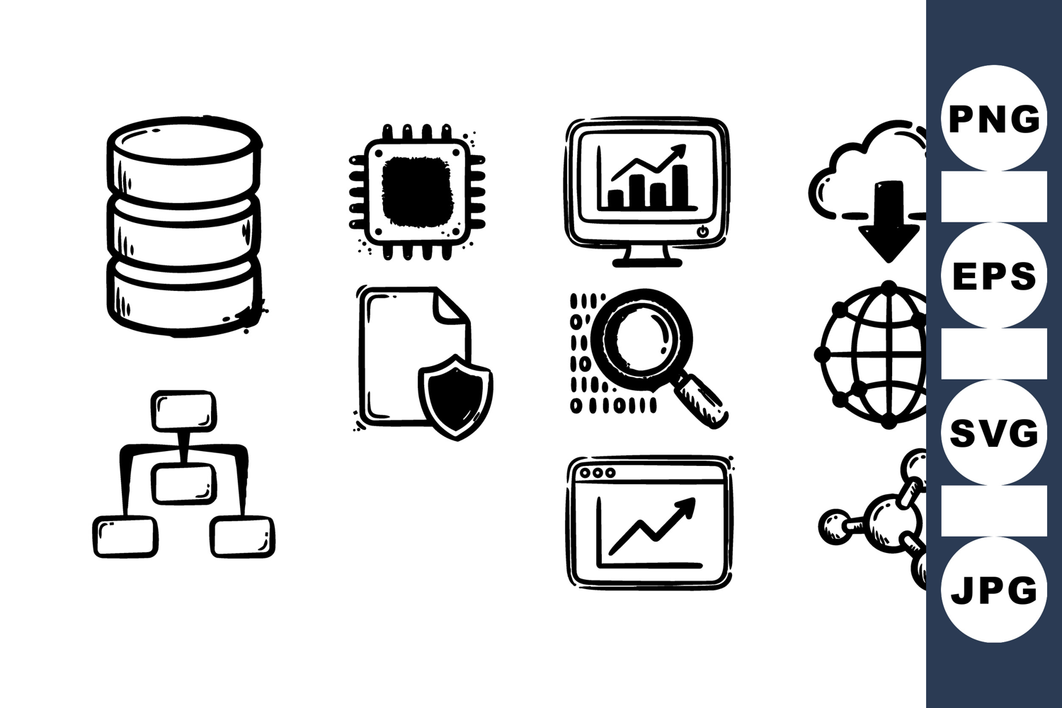 of hand drawn technology icons illustrating database, microchip, computer monitor with analytics, cloud download, network globe, organizational structure, security shield, magnifying glass, browser graph, and molecular connections in black line art style, ideal for tech presentations and digital design projects with a minimalistic and clear appearance.