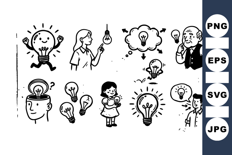 A whimsical black and white doodle style vector featuring people with lightbulbs symbolizing ideas, creativity, and thinking process in playful and inspiring compositions.