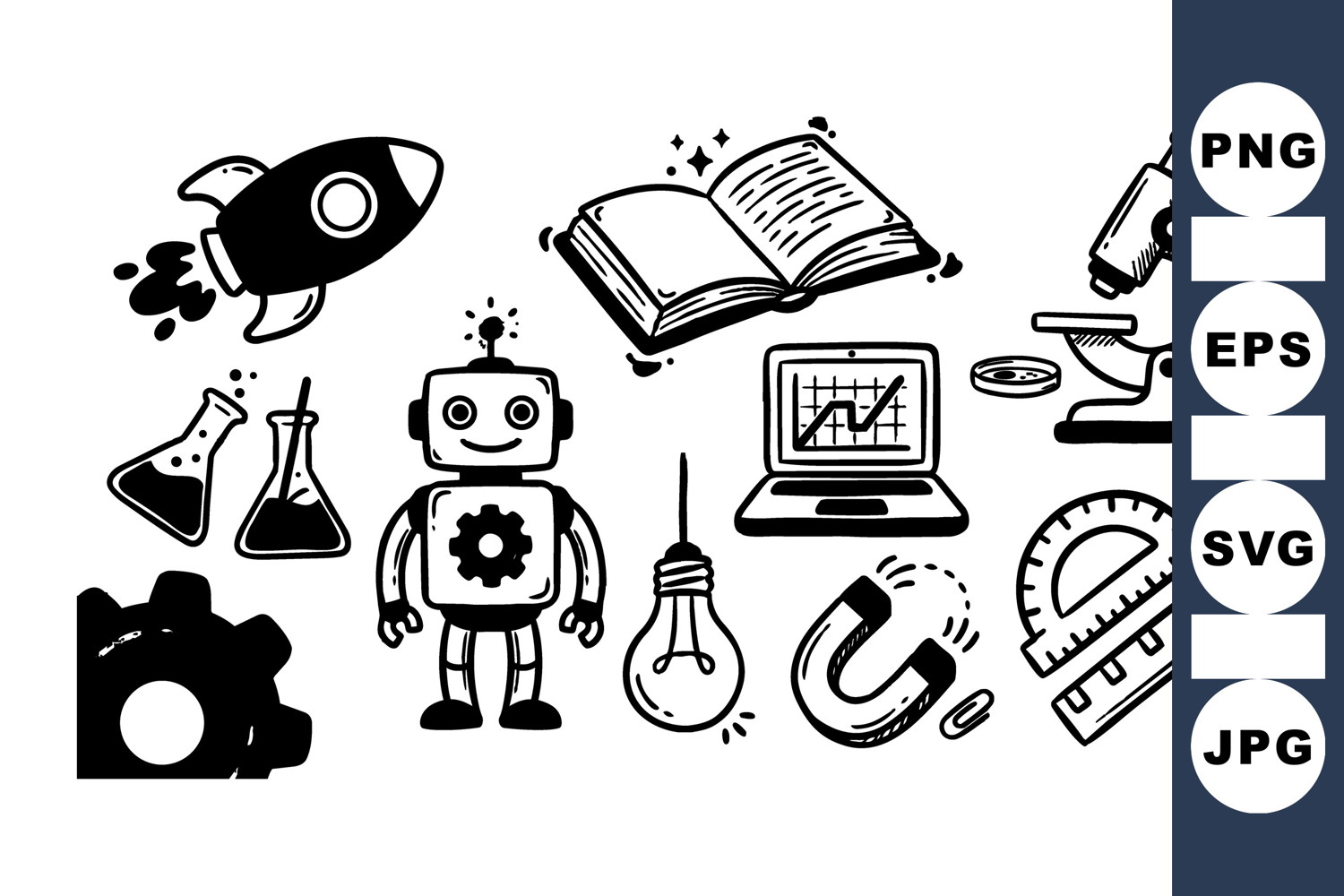 Hand Drawn Robot Open Book Illustration Light Bulb Drawing Science Icon Design Rocket Clipart Art Microscope Graphic Design Magnet Illustration Vector Education Science Tools Lab Flask Artwork Gear Wheel Graphic