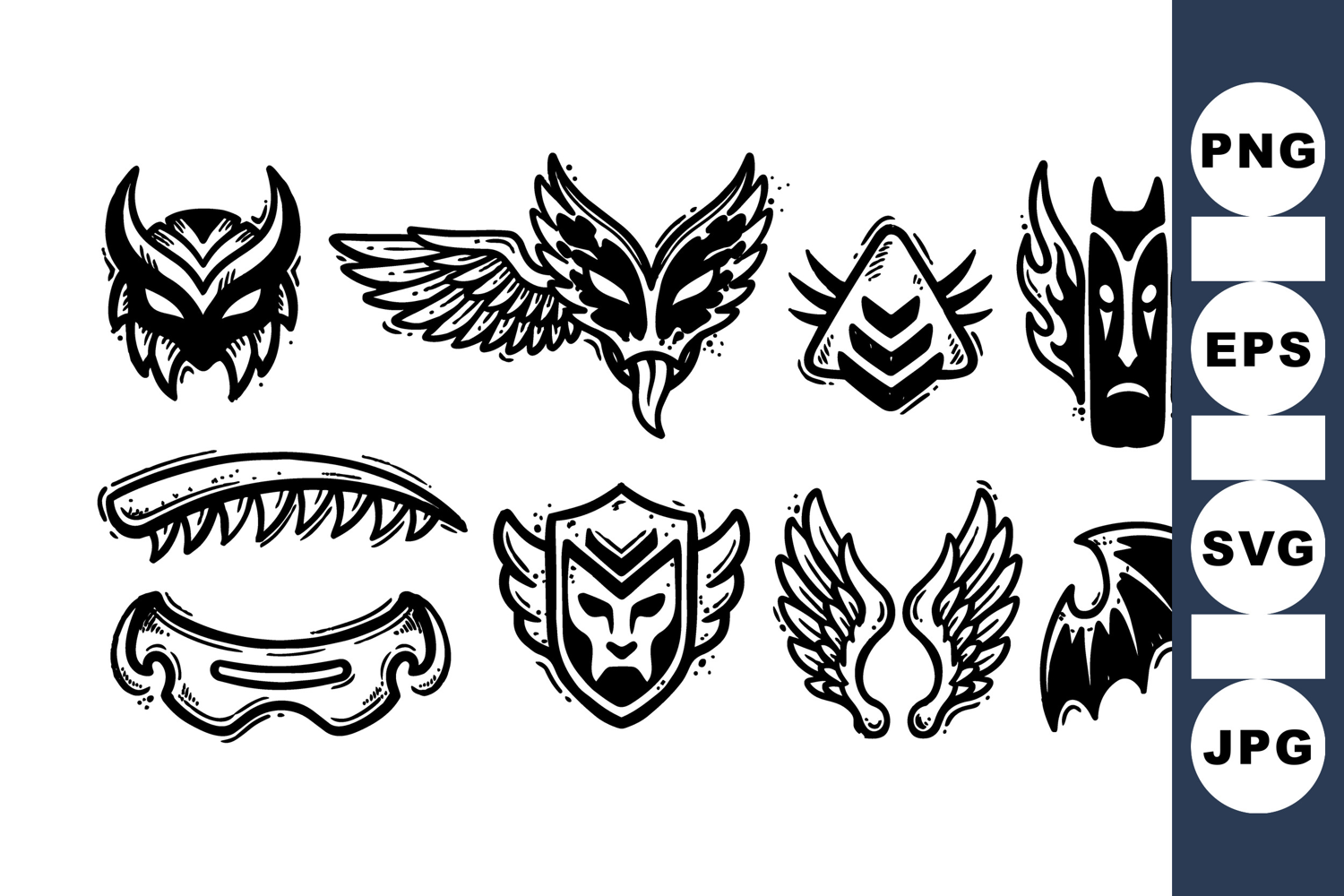 Shield Emblem Vector Tribal Symbol Graphics Dark Gothic Icons Winged Mythical Designs Tribal Warrior Illustration Bat Wing Clipart Mask Design Artwork Ornate Tribal Motifs Dark Art Illustrations