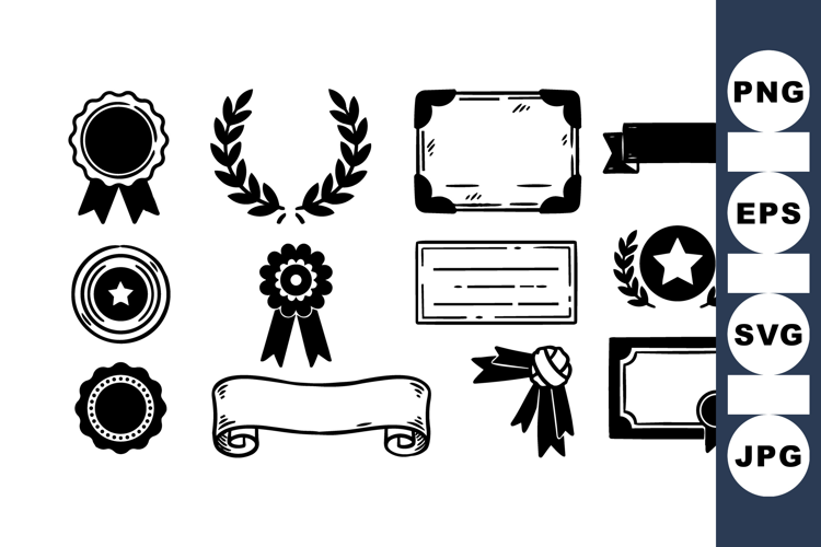 Black and white vector icons featuring ribbon awards, certificate frames, badges, laurels, and banners in flat design style suitable for graphic resources and branding projects, clean and minimal.