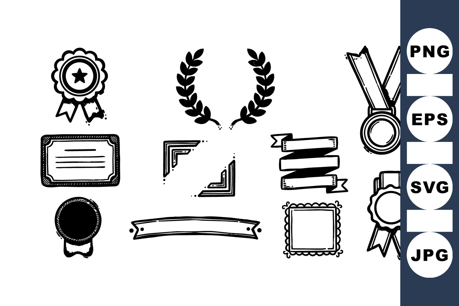 Collection of hand sketched black and white award ribbons, medals, laurel wreaths, certificate frames, and corner decorations in vector style suitable for design and branding projects with vintage charm.
