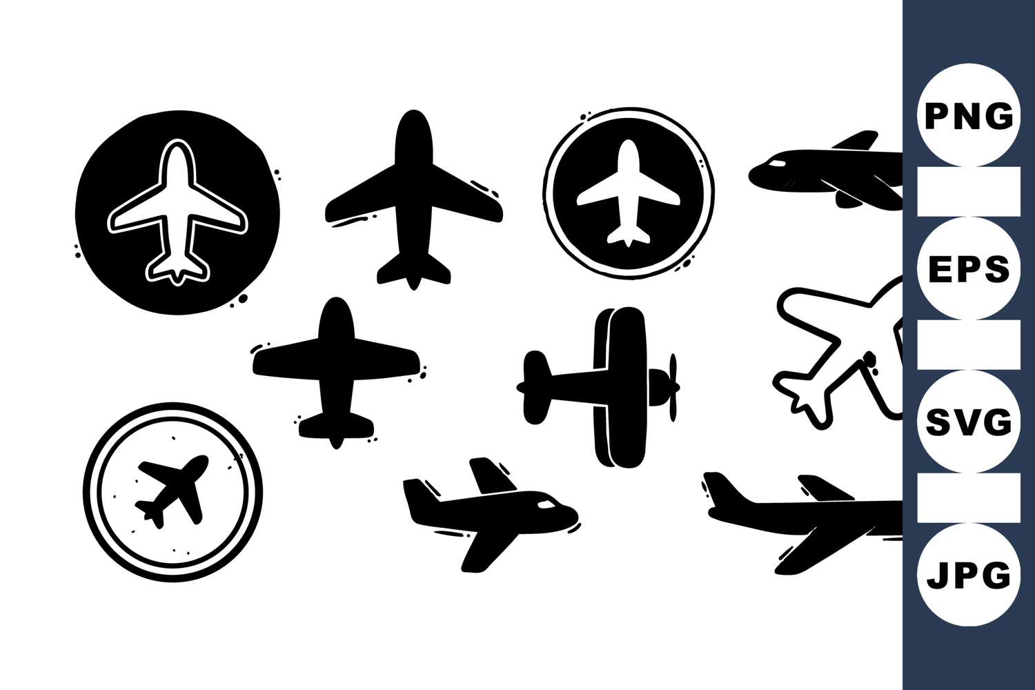 A collection of black and white airplane icons featuring different aircraft shapes and perspectives. these vector graphics suit travel branding, web icons, and print design with minimalist mood.
