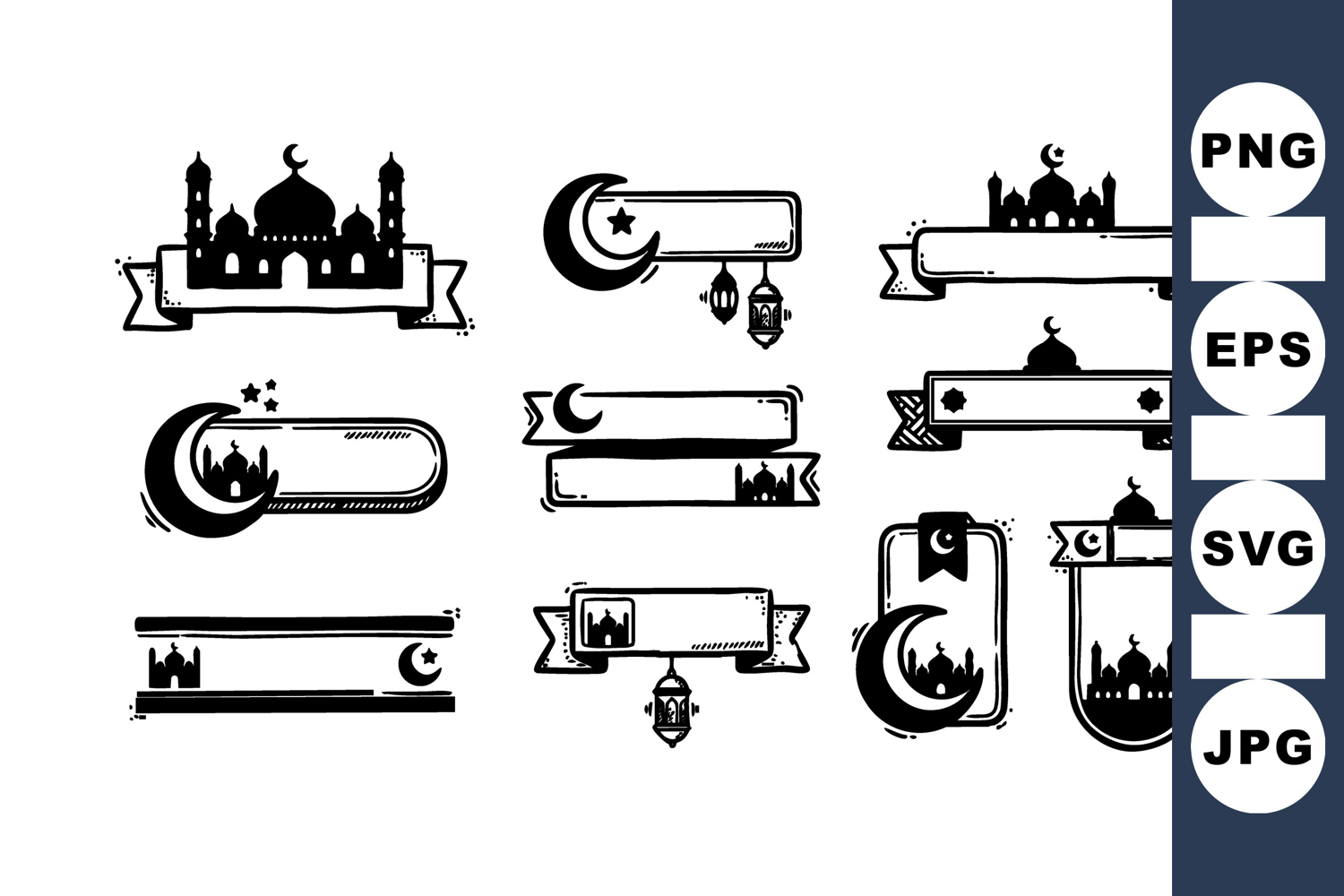 A collection of hand drawn vector banners featuring islamic mosques, crescent moons, and hanging lanterns with blank ribbon tags for customizable religious or festive designs, spiritual mood.