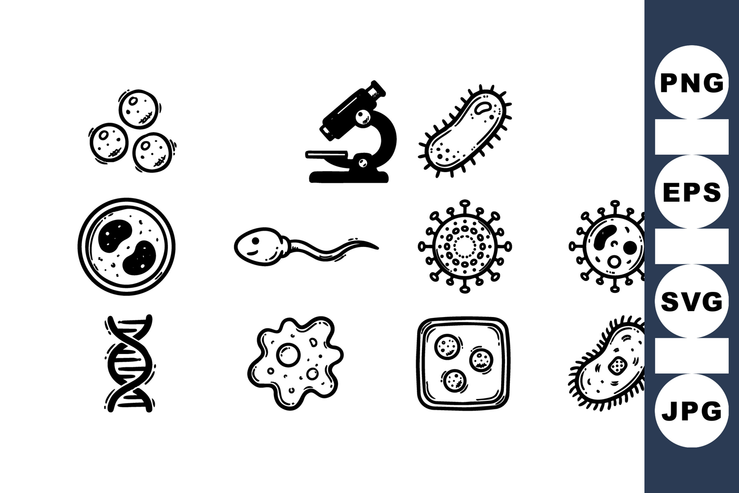 Black and white hand drawn style vector showing microscope, cells, bacteria, viruses, dna strand, sperm, and amoeba with clean lines for educational, medical, and scientific design purposes.