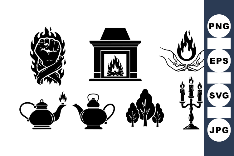 A collection of black silhouette vector icons including a flaming fist, burning fireplace, flaming teapots, trees, and a three candle candelabra in minimalist style, bold and symbolic.