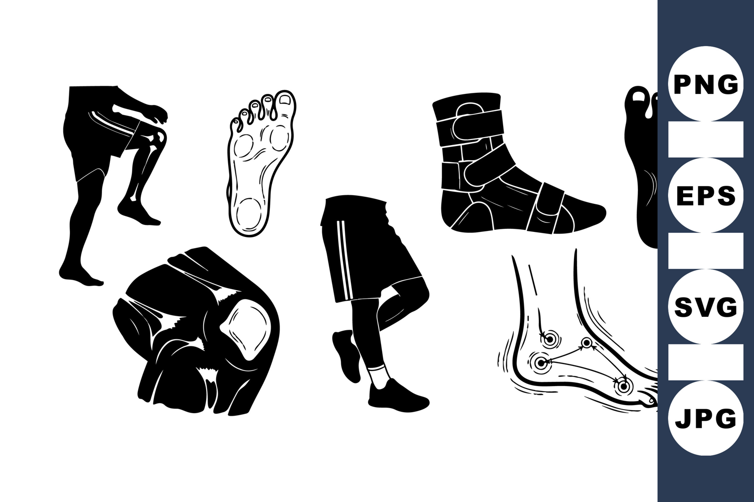 Abstract black and white vector artwork depicts knee injury, foot anatomy with pressure points, leg pain posture, and bandaged ankle, useful for medical, sports injury, therapy contexts in minimal style.