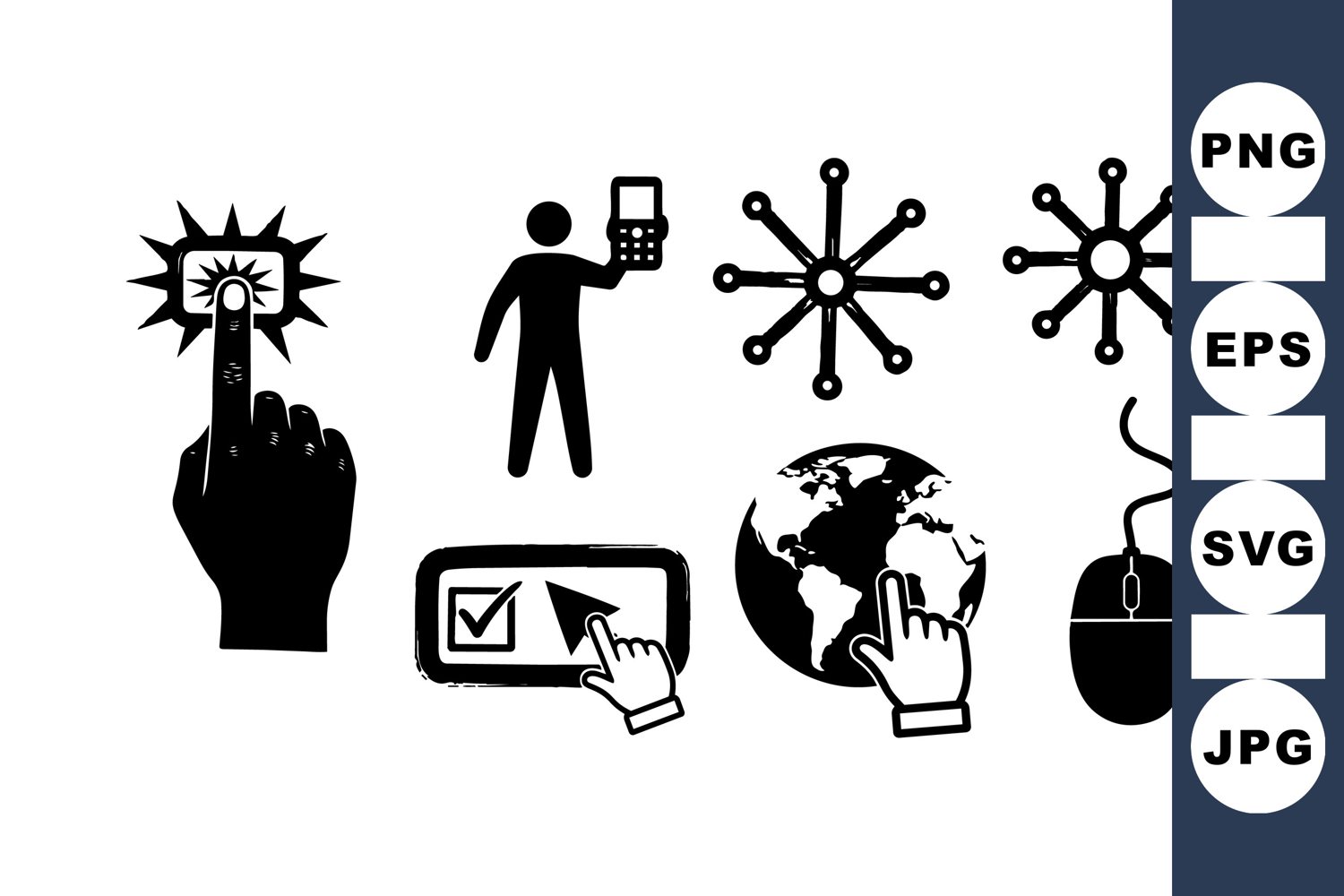 Black silhouette icons include a hand pressing a digital button, person holding a device, network connections, globe with hand pointer, and computer mouse representing technology and interaction concepts