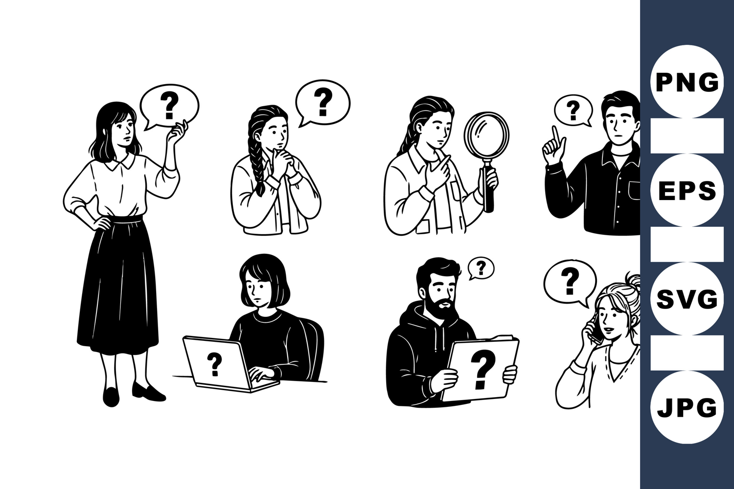 Black And White Clipart Office Worker Clipart Question Mark Vector Curious People Illustration Thinking Pose Design Magnifying Glass Graphic Speech Bubble Drawing Confused Character Art Digital Conversation Icon Inquisitive Face Illustration