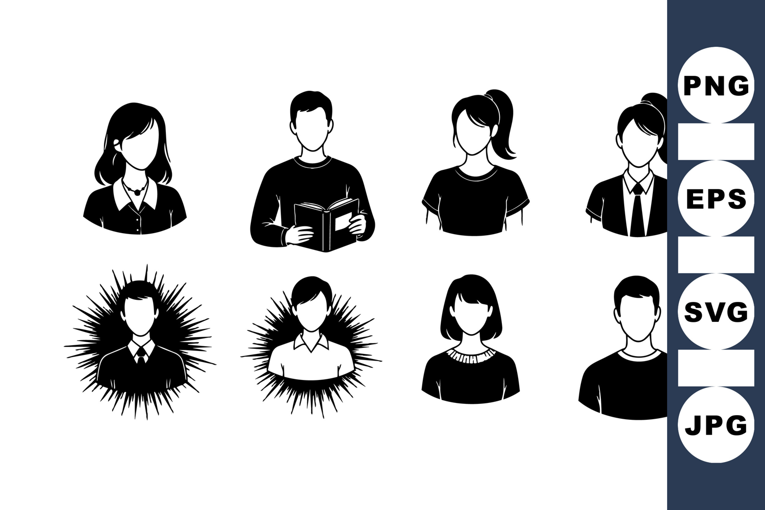 Collection of black and white vector icons showing faceless people with diverse hairstyles and clothing styles including casual and business wear, featuring reading and neutral poses for general use.