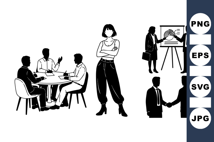 Black and white vector silhouettes depict business interactions including a group meeting, confident woman standing, a handshake, and a presentation with charts, conveying professionalism and collaboration mood.