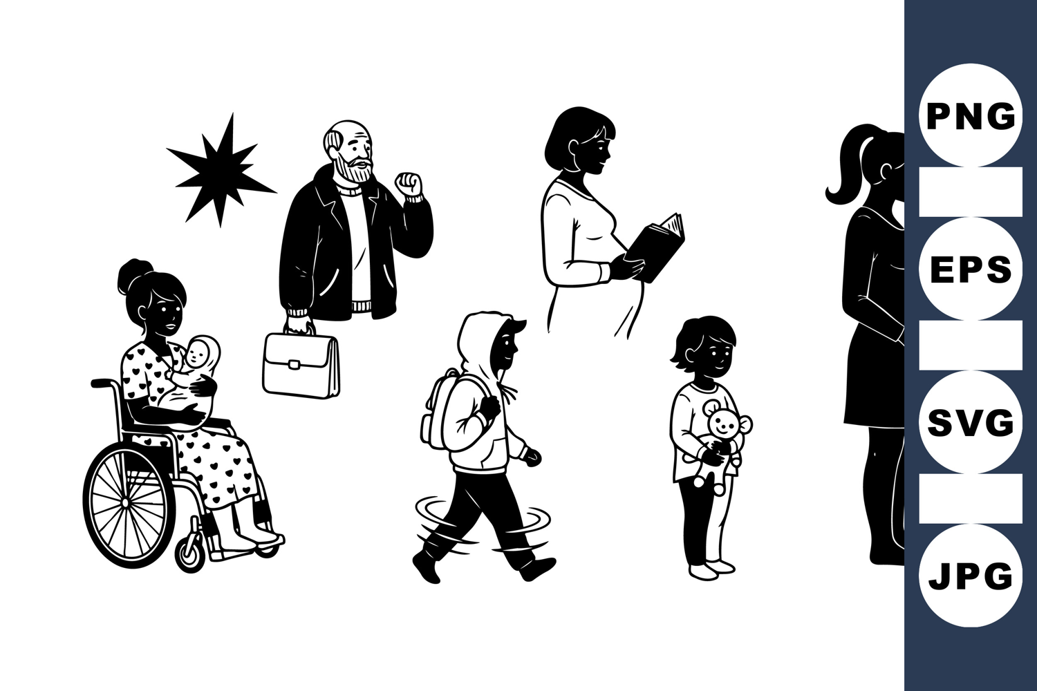 Black and white vector art depicting different life stages and family moments including pregnancy, childcare, and everyday walking in minimal silhouette style with peaceful mood.
