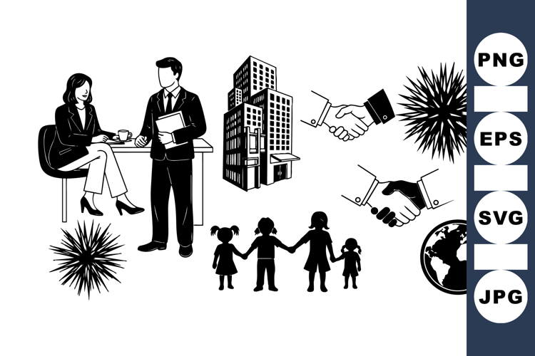 A clean black and white vector showing a businesswoman with coffee and man holding files near tall buildings, handshake symbols, a family holding hands, and a globe icon in silhouette style.