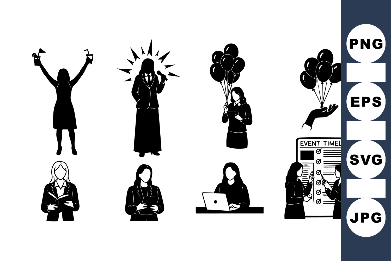 Business Woman Silhouette Woman With Laptop Business Meeting Clipart Office Worker Illustration Professional Female Icon Corporate Woman Design Female Leader Graphic Event Planning Vector Balloon Holding Figure Presentation Timeline Art