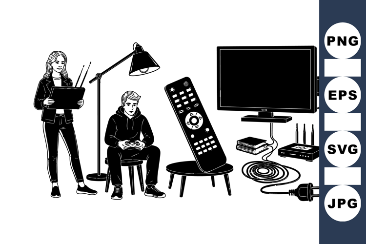 Monochrome vector art depicts a young man seated playing a video game controller and a woman standing with a drawing tablet beside a floor lamp and multimedia equipment, emphasizing casual indoor leisure and creativity.