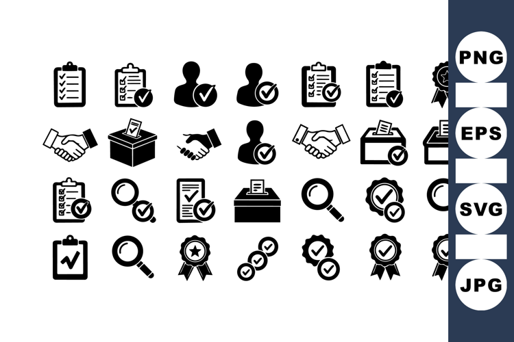A collection of black and white vector icons including checklists with check marks, handshakes, ballot boxes with votes, verified user profiles, magnifying glasses, and award badges in a clean flat style, suitable for business and administration themes with a professional tone.
