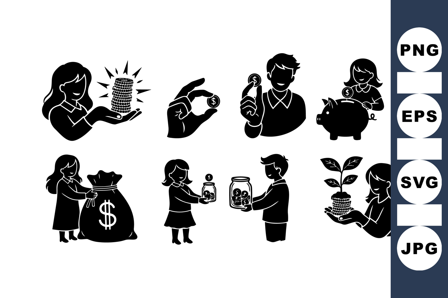 Black silhouette vector illustrations depicting people saving coins, handling money bags, and investing coins into a growing plant, symbolizing financial growth and saving habits in a minimalist style.