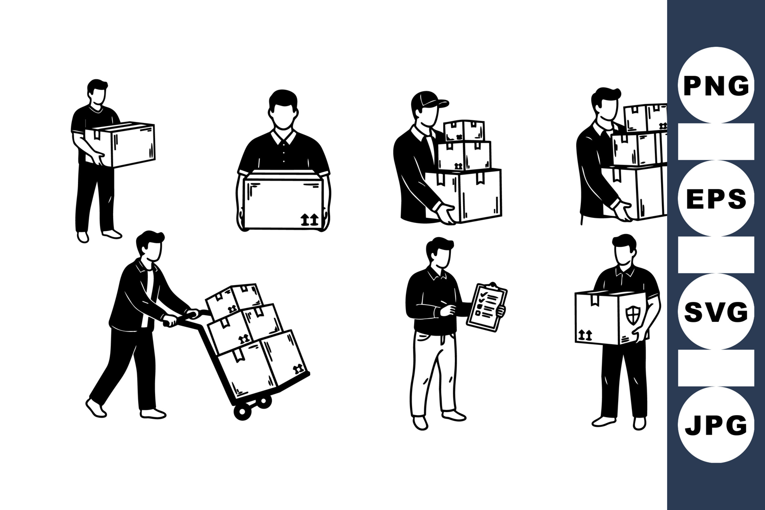 Collection of minimalist black and white vector illustrations showing delivery men carrying stacked boxes, pushing hand trucks, and holding clipboards in simple line style, functional and clean.