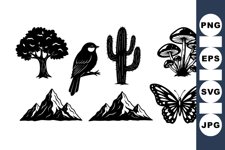 Nature Silhouette Design Mountain Vector Illustration Eco Friendly Illustration Outdoor Wildlife Graphics Forest Plant Silhouette Desert Cactus Vector Bird Perched Graphic Wild Mushroom Drawing Butterfly Wing Artwork Natural Landscape Image