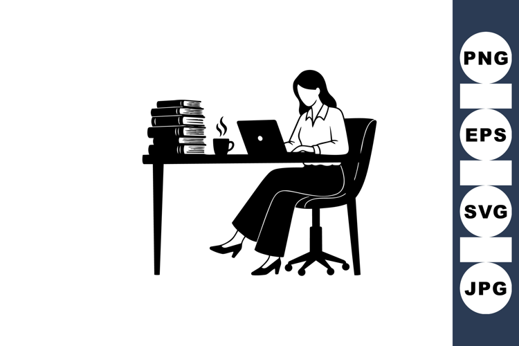 Minimalist black and white vector design shows a woman focused on typing at her laptop with books and a steaming coffee mug on her office desk, conveying work or study concentration.