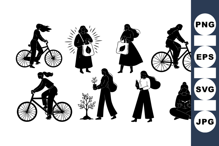 Silhouetted women engage in sustainable activities such as biking, carrying eco bags, planting saplings, and reading while seated. flat design style suits environmental campaigns or educational content with a clean, minimalist mood.