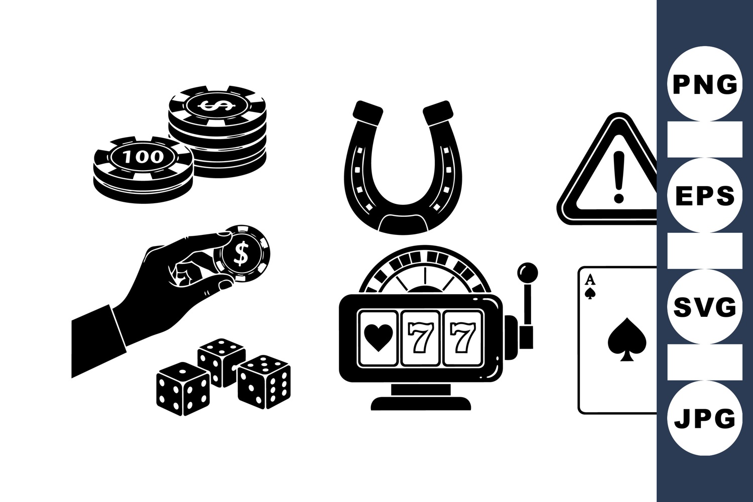 Casino Gambling Icons Gambling Chip Graphics Slot Machine Illustration Poker Card Clipart Dice Roll Artwork Luck And Fortune Hand Holding Chip Casino Warning Symbol Blackjack Card Design Horsehoe Luck Icon