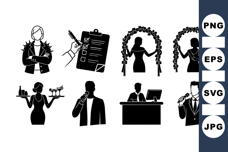 Black silhouette vector icons depict various characters including a confident woman with crossed arms, a checklist being marked, brides holding floral arches, waitstaff serving drinks, and men speaking into microphones in formal settings for versatile use.