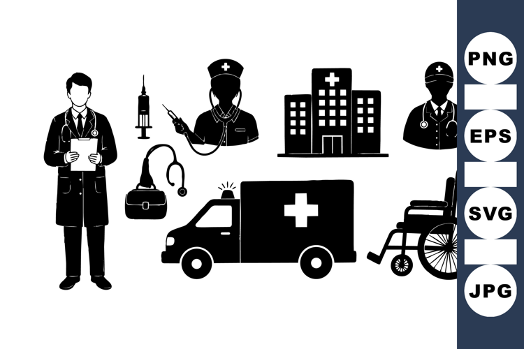 Simple black and white healthcare vector icons display medical professionals, ambulance, hospital, wheelchair, and tools in a clean minimalist style suitable for medical design projects or educational materials.