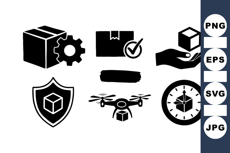 A collection of black silhouette icons representing parcel delivery, package handling, security shield, drone transport, and time management with a bold simple design for logistics applications.