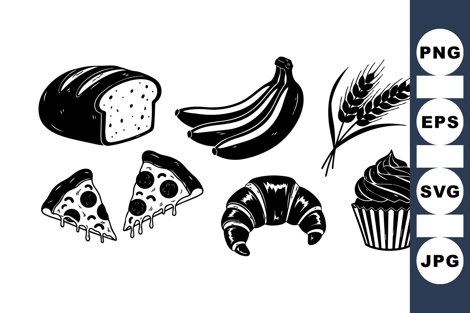 Monochrome vector depicting bread loaf, bananas, wheat ears, pizza slices, croissant, and cupcake illustrations in black and white style for food branding or menu design, simple and clean.