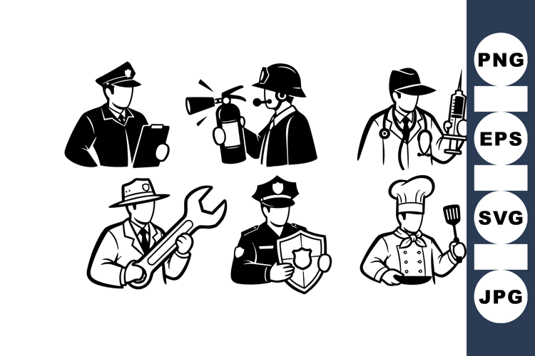 Black And White Svg Worker Silhouette Design Manual Labor Illustration Professional Worker Icons Occupation Vector Art Doctor Chef Firefighter Police Mechanic Clipart Service Industry Graphics Medical And Safety Icons Emergency Responder Art