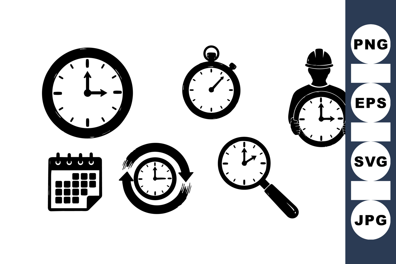 of black vector icons including wall clock, stopwatch, calendar, magnifying glass with clock, worker holding clock, and clock with arrows, illustrating time management and scheduling themes in minimal style.