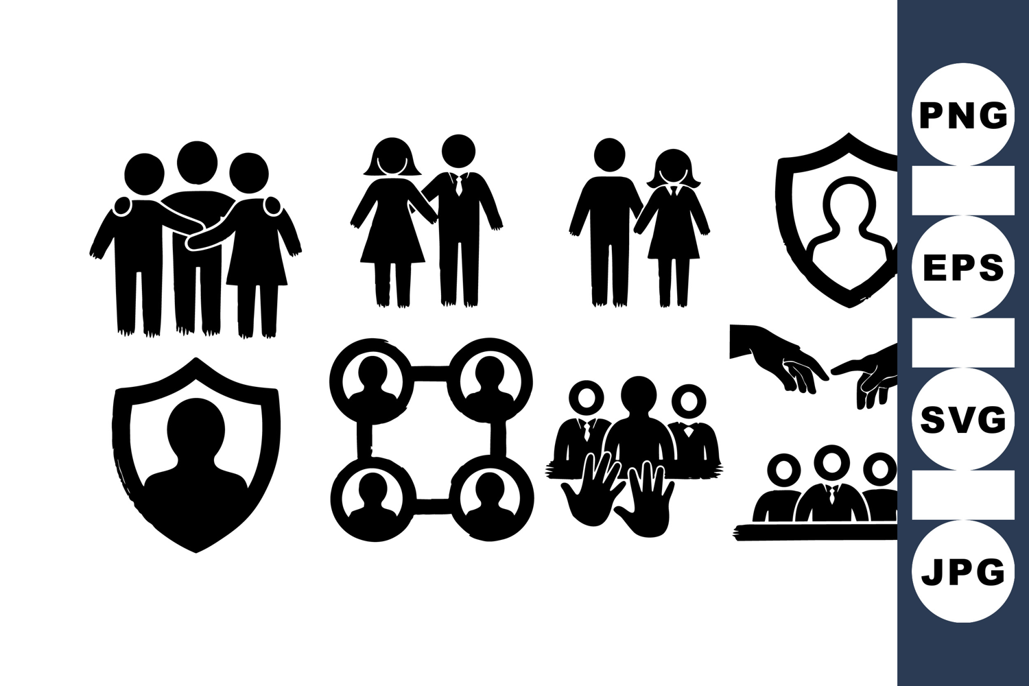 Black silhouette vectors depict various group, partnership, shield privacy, and network connection icons representing teamwork, security, and business collaboration in a flat design style.