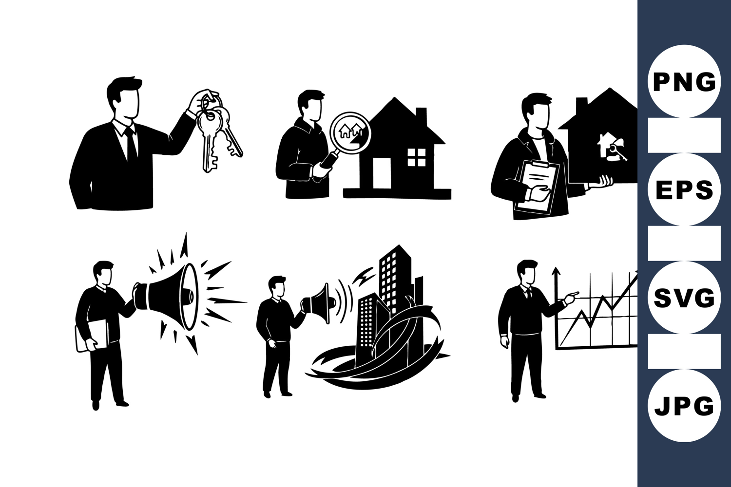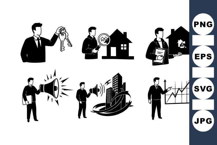 Black and white vector silhouette depicts business people holding keys, magnifying house, presenting with megaphone, urban buildings, and graph analysis in minimalist style, professional and clear.