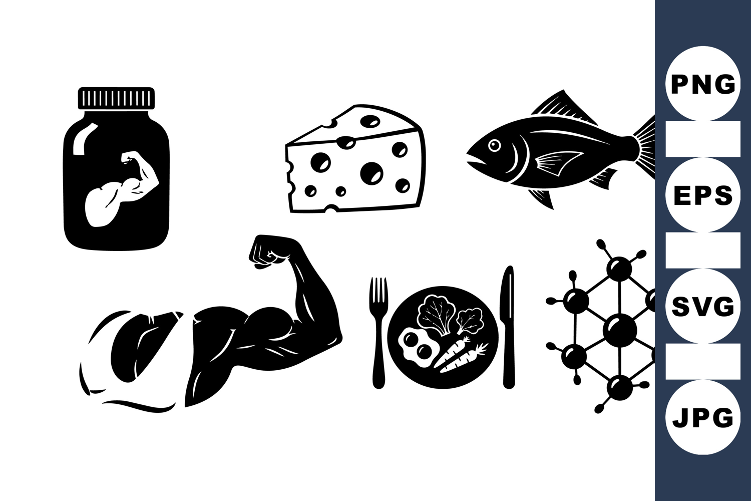 Black vector icons featuring muscular arm, protein jar, cheese, fish, balanced meal, and molecular structure representing nutrition and fitness concepts with clear silhouette style.