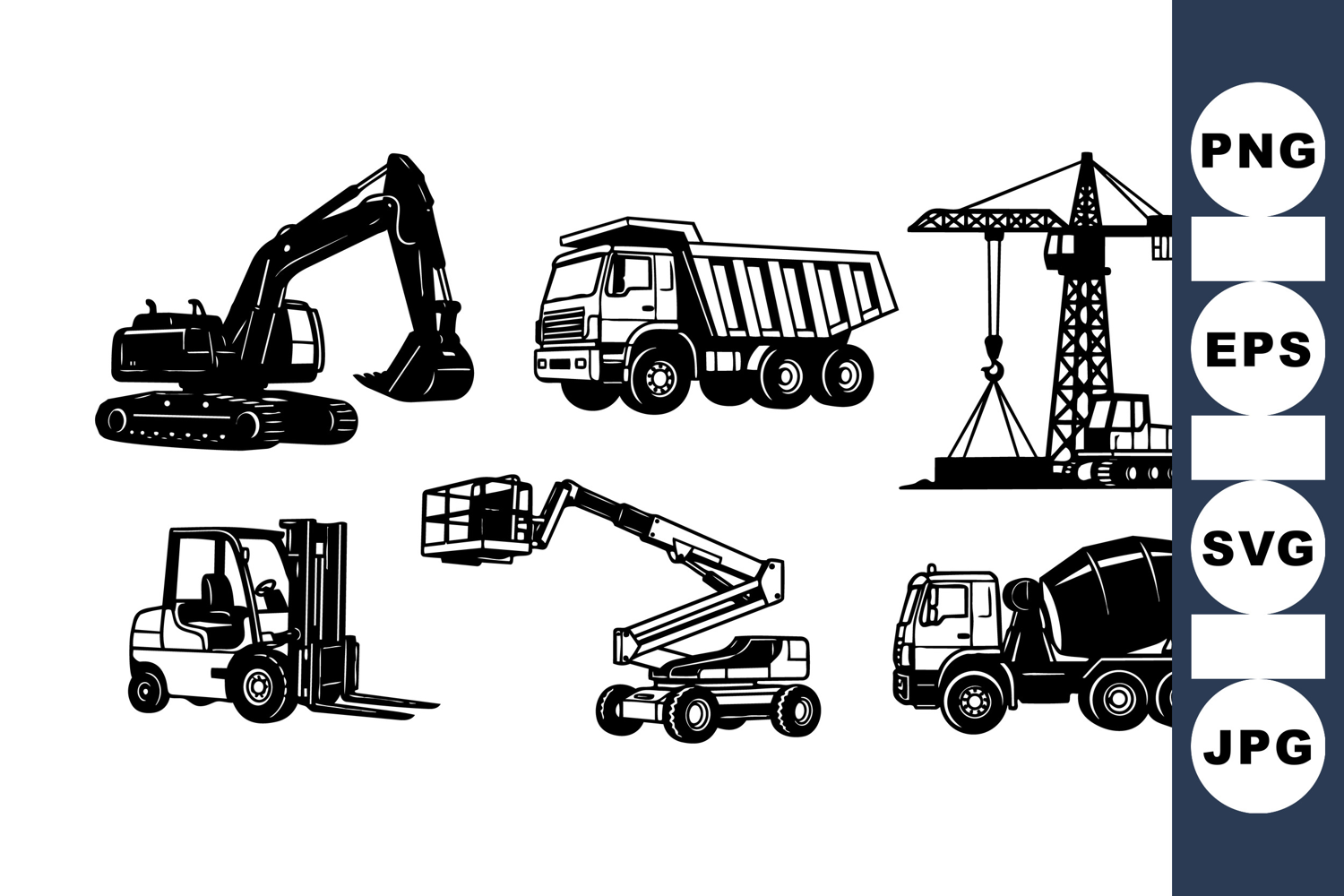 Construction Machinery Clipart Heavy Equipment Graphics Industrial Vehicle Design Excavator And Crane Forklift Machine Clipart Dump Truck Illustration Concrete Mixer Drawing Crane Hook Graphic Worksite Equipment Art Vehicle Silhouette Design