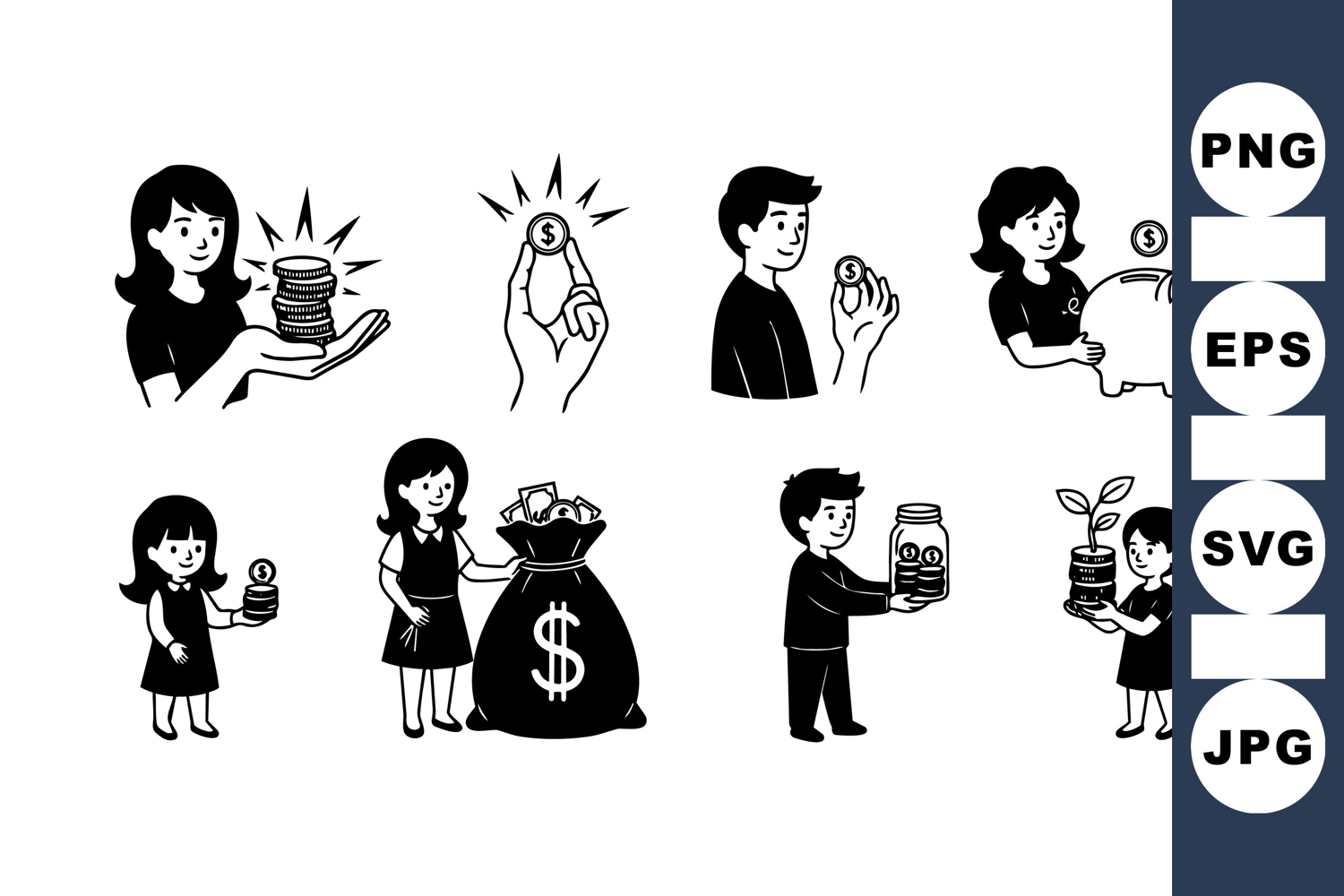 Various black and white vector illustrations of men and women holding coins and cash, saving money, piggy bank usage, and investing in plant growth, in a minimalist style with clear line art.