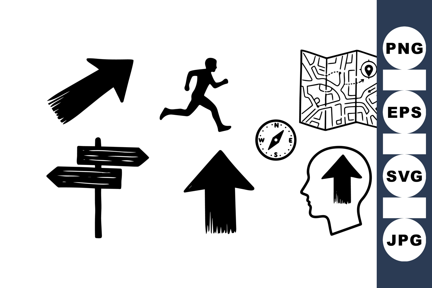 A black silhouette running figure accompanied by directional arrows, a compass, and a city map icon illustrating the concept of navigation, focus, and goal oriented mindset with clear minimal style.