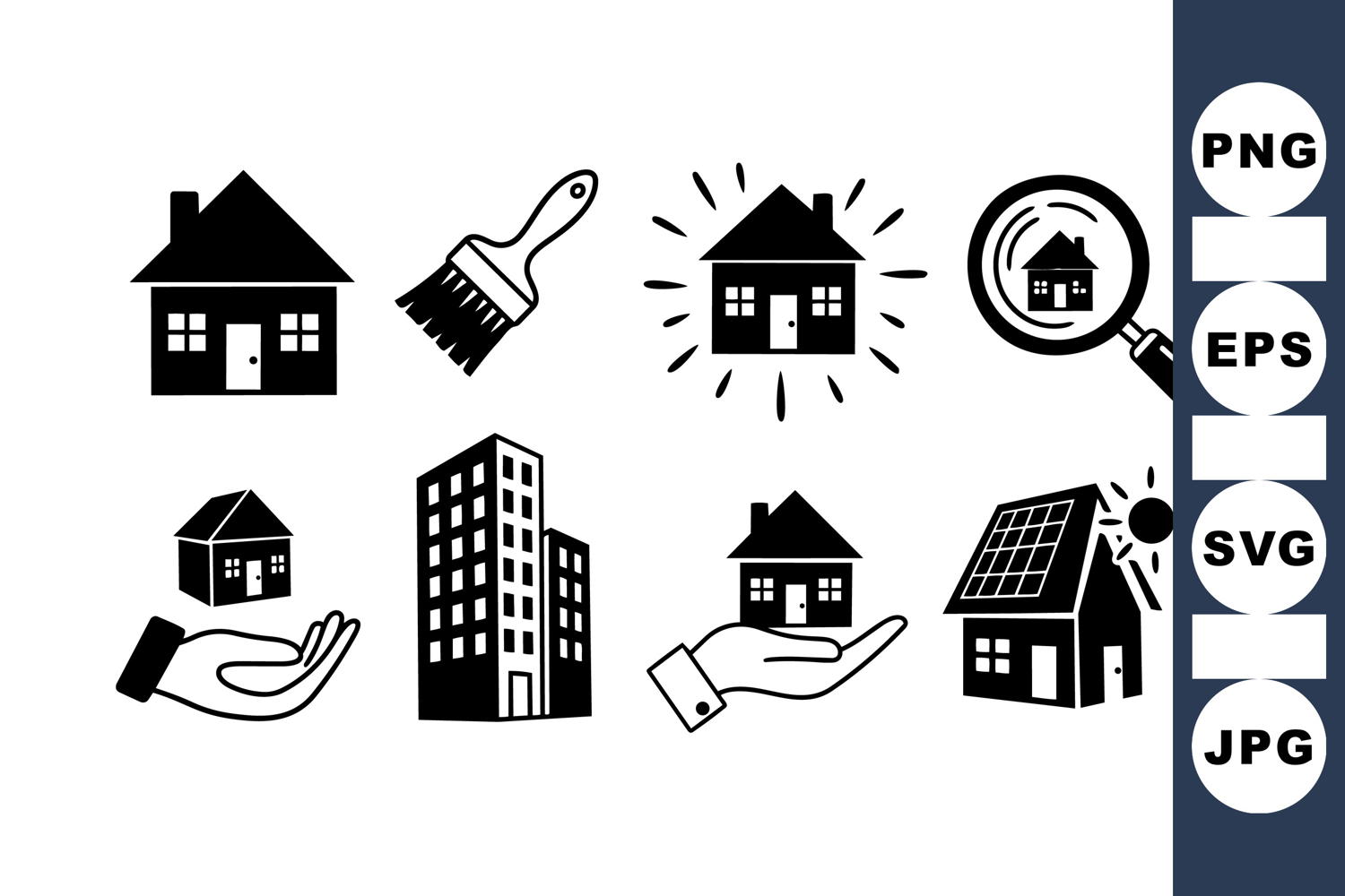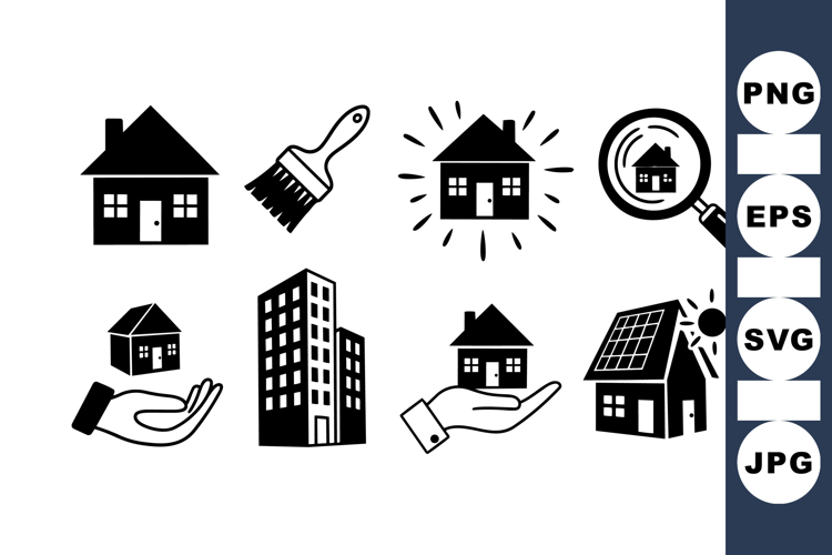 Collection of black silhouette icons showing houses, a paintbrush, solar panel with sun, magnifying glass, and hand holding property symbolizing real estate, home care, and sustainable energy ideas in minimalist style.