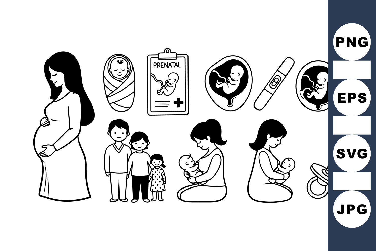 A black and white vector collection illustrating pregnancy stages, prenatal care symbols, family members, breastfeeding mothers, and baby items, presented in simple line art style for educational and health use.