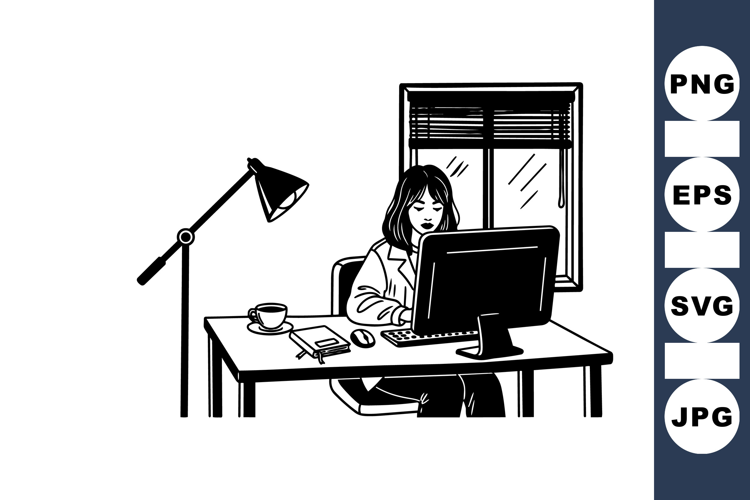 Black And White Woman Working At Desk Illustration example image 1