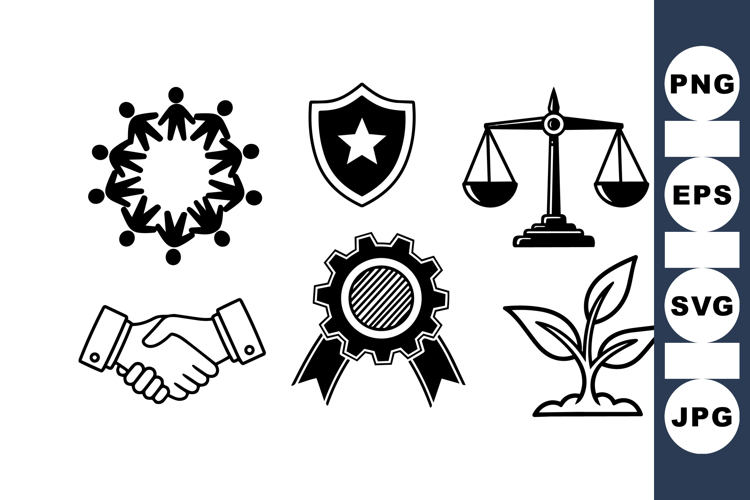 Minimalist black and white vector icons depicting concepts of teamwork, protection, justice, cooperation, achievement, and growth using clean line art for versatile graphic use in business and social themes.