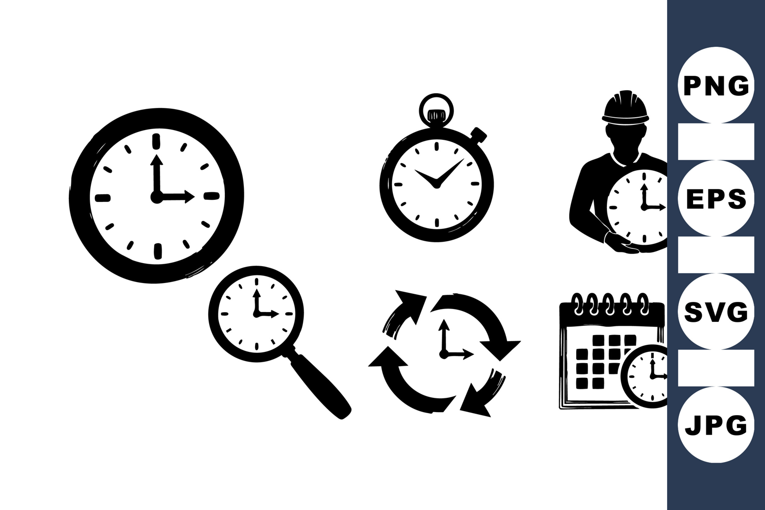A collection of black silhouette icons featuring clocks, stopwatch, calendar with clock, magnifying glass over clock, time cycle arrows, and worker holding clock illustrating time management concepts in vector style.