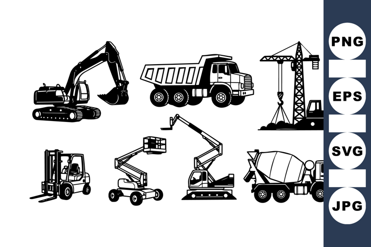 A collection of black and white vector illustrations of construction vehicles such as excavator, dump truck, crane, forklift, boom lift, and cement mixer in clean minimal style, suitable for construction or industrial themed designs and presentations, with a crisp and technical look.