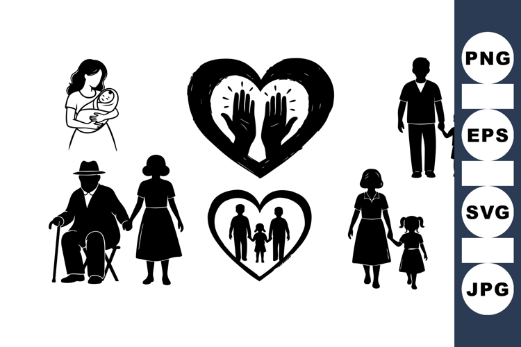 Black silhouette family members including parents, children, and elderly individuals connected by heart shapes representing love, unity, and support in a minimalistic vector style with peaceful mood.