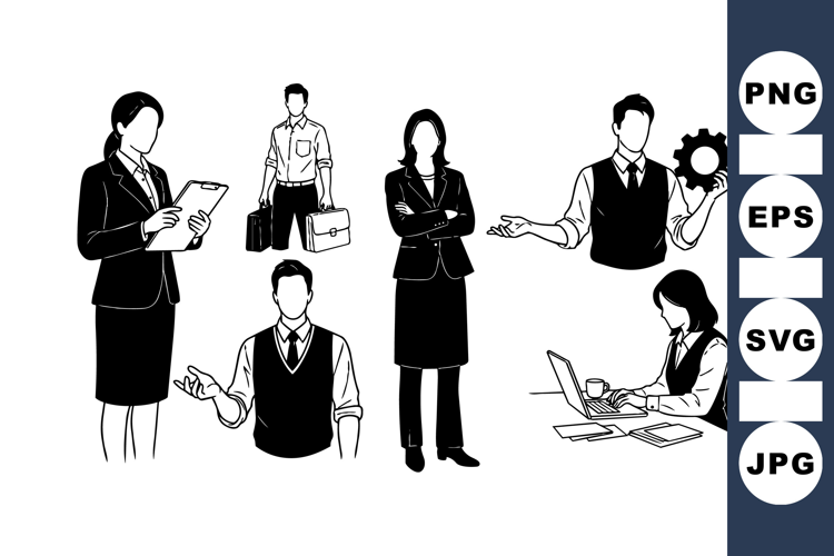 Formal Business Attire Office Teamwork Illustration Business Professional Clipart Corporate Worker Illustration Office Staff Vector Businessman Silhouette Graphic Woman Office Worker Design Professional Work Scene Executive Vector Image Man With Gear Icon